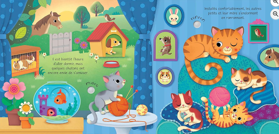 Des chats ronronnent, des chiens jouent et aboient… Dix enregistrements sonores animent les animaux préférés des tout-petits. Les illustrations pleines de charme de ce livre à toucher et à écouter sont agrémentées de trous et de chemins en creux.
